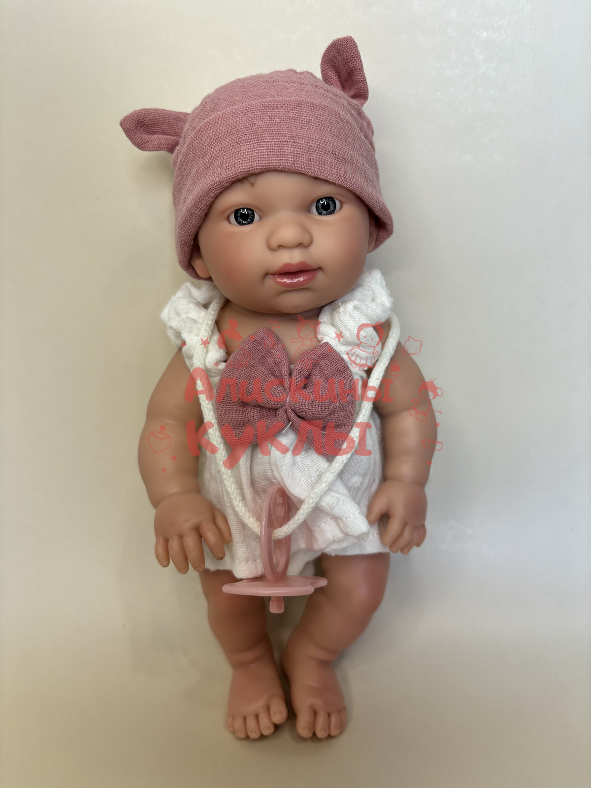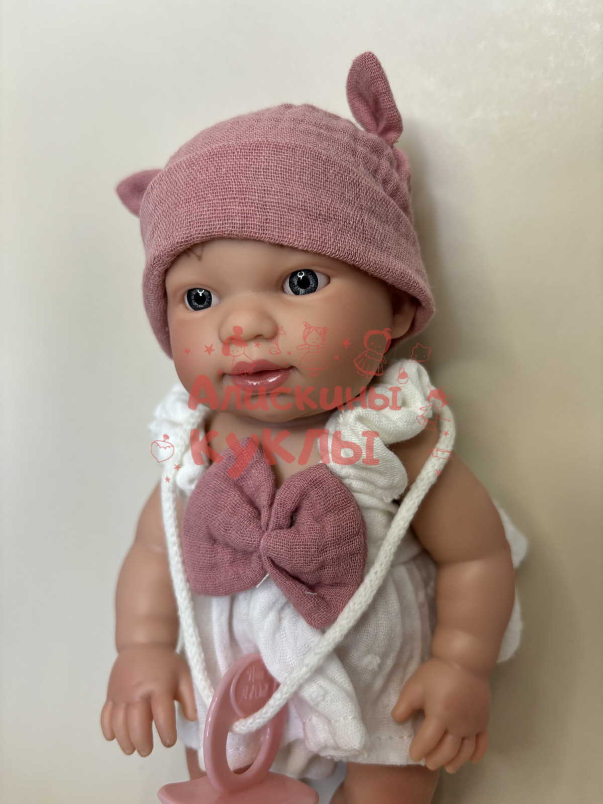 Кукла оснащена акриловыми серыми глазками без ресничек, которые не закрываются. Она одета в комплект, состоящий из трусиков и сарафанчика, и на её голове есть повязка. В комплекте также идет соска, которая не вставляется в ротик и служит исключительно в качестве декоративного аксессуара. Одежда у куклы полностью съемная.